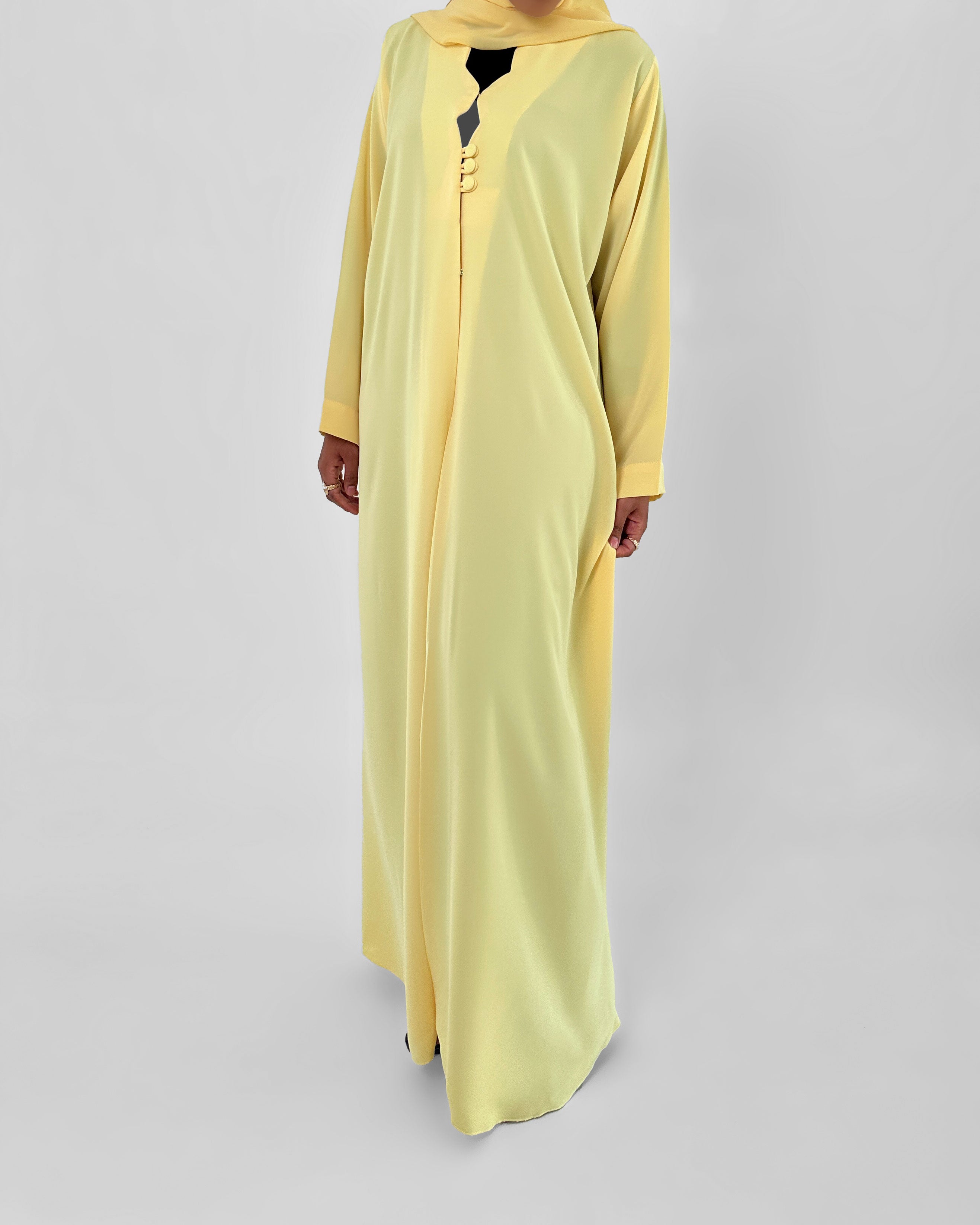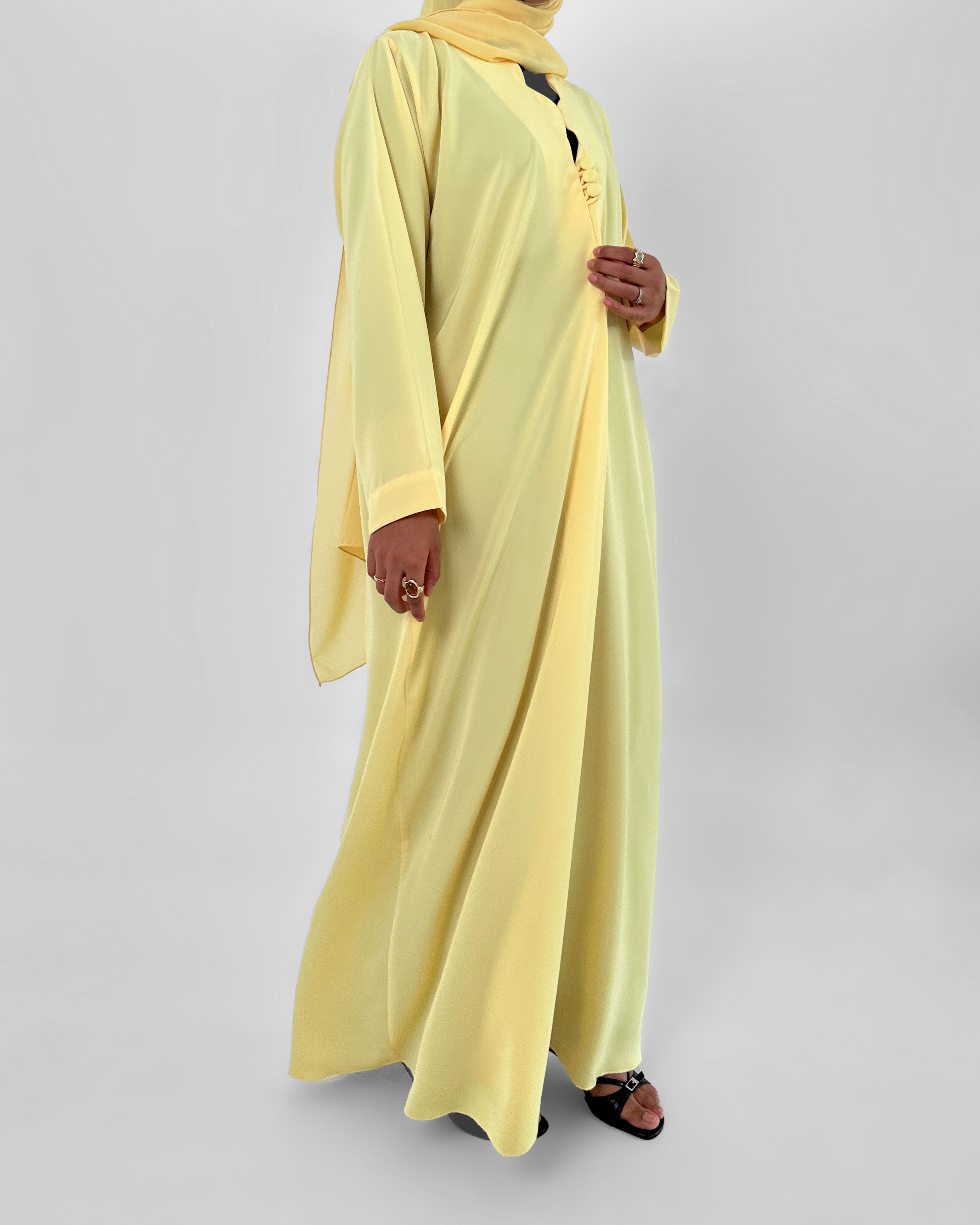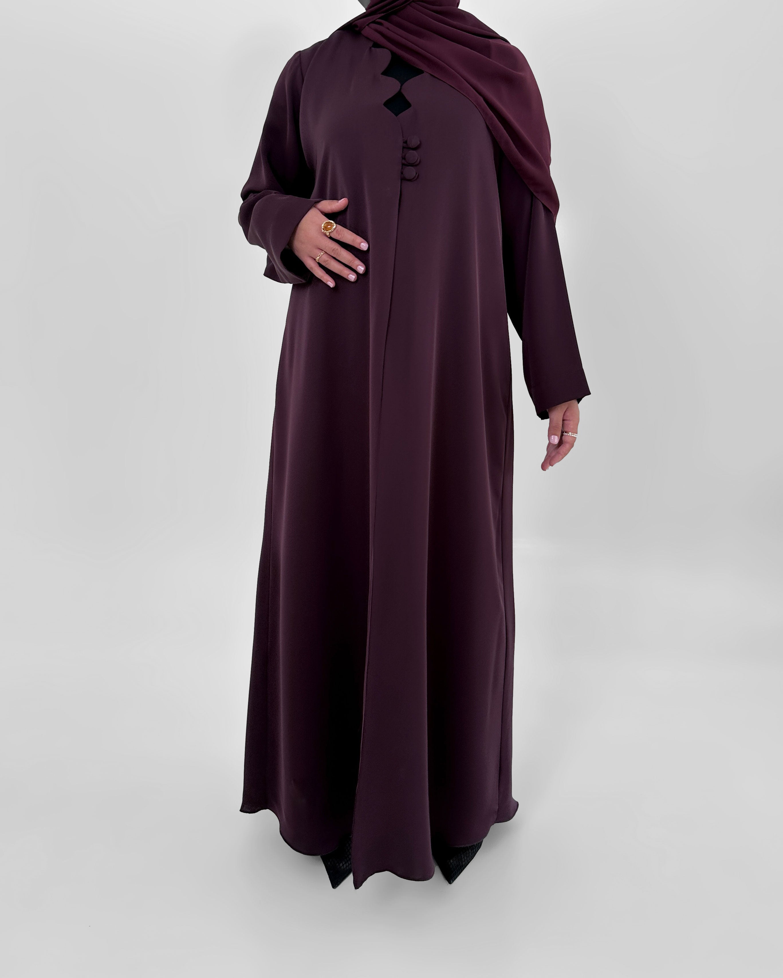 Aamira est confectionnée en nida coréen, un tissu reconnu pour sa légèreté et sa fluidité. Cette abaya se distingue par une découpe en vague élégante au niveau du buste, sublimée par trois boutons délicats. Son tombé naturel et raffiné épouse la silhouette avec grâce, offrant un équilibre parfait entre confort et sophistication.
